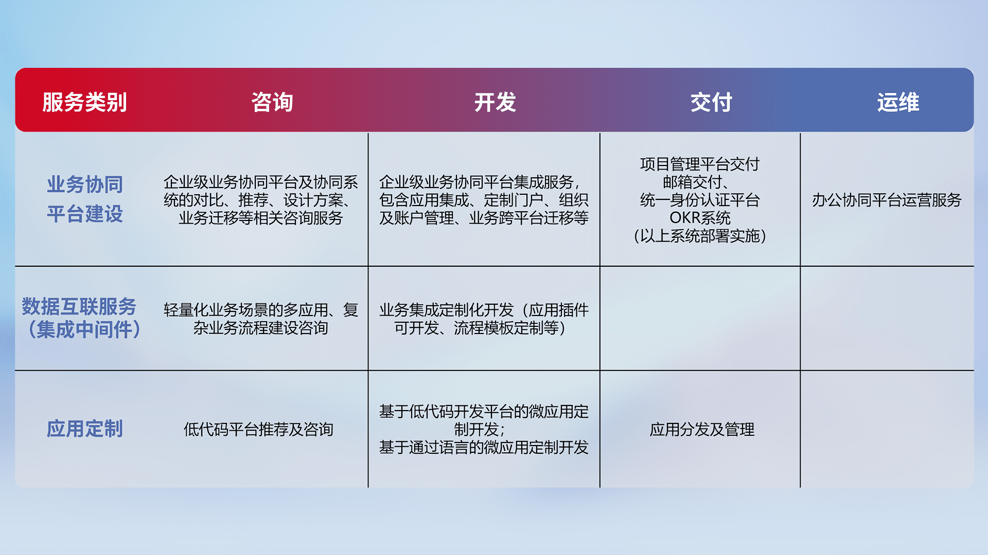 针对钉钉、、、、企微、、、、IDaas等平台级产品提供产品的规划、、、方案、、、、交付、、定制化开发等服务,,,实现如统一协同办公、、、智能客户服务、、、混合会议管理、、、智能数据查询、、、等业务场景,,,,实现数字化转型。。。。
